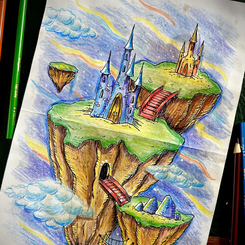 – איור בצבעי עיפרון ממלכות מרחפות ומפות מכושפות