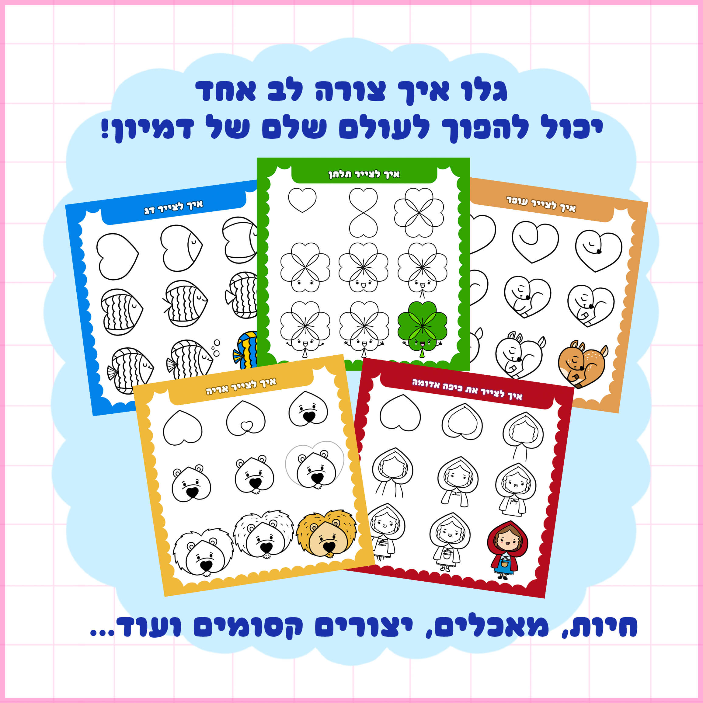 חוברת להורדה ישירה אליכם למחשב ובה תגלו קסם אמיתי! הבסיס לכל הדמויות שאתם הולכים לצייר בעזרת החוברת היצירתית הזו, מתחילות תמיד מצורת לב! תוכלו לאייר: חיות, מאכלים, יצורים קסומים ועוד..